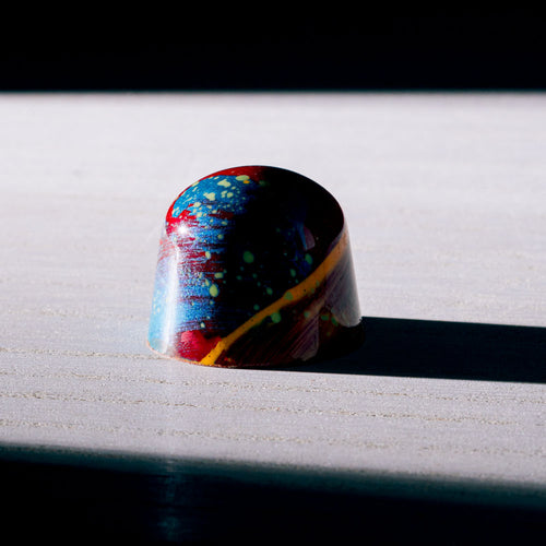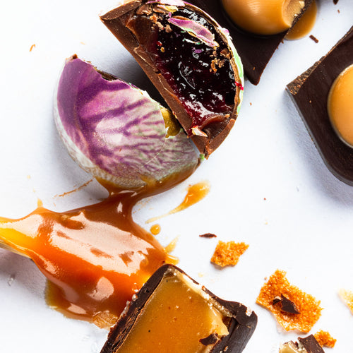 We want every bonbon and bar in our collection to spark joy while hinting at the distinctive flavours within. With each chocolate creation, we have to decide when brighter is best and when less is more. Sometimes we choose to leave the shell unpainted, other times we feel drawn to creating an abstract work of spattered art or a refined pattern.