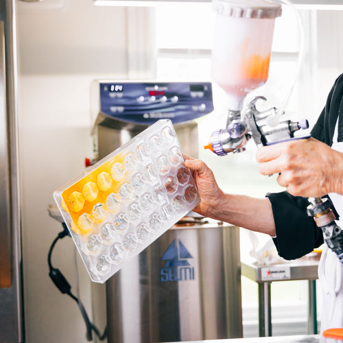 Our molds are the canvas for our chocolate creations. As such, we ensure they are polished to perfection before we begin. This is the secret to a super shiny chocolate shell that glistens.